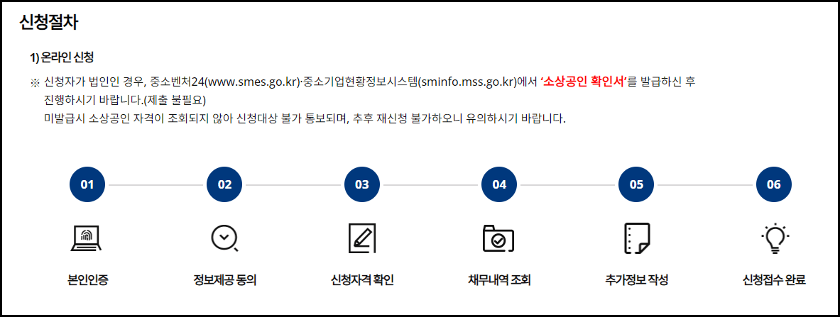 온라인신청은 새출발기금.kr 홈페이지에서 평일 24시간 신청이 가능합니다. 신청자가 법인일 경우, 중소벤처24(www.smes.go.kr) 혹은 중소기업현황정보시스템(sminfo.mss.go.kr)에서 '소상공인확인서'를 발급받은 후, 진행하셔야 합니다.