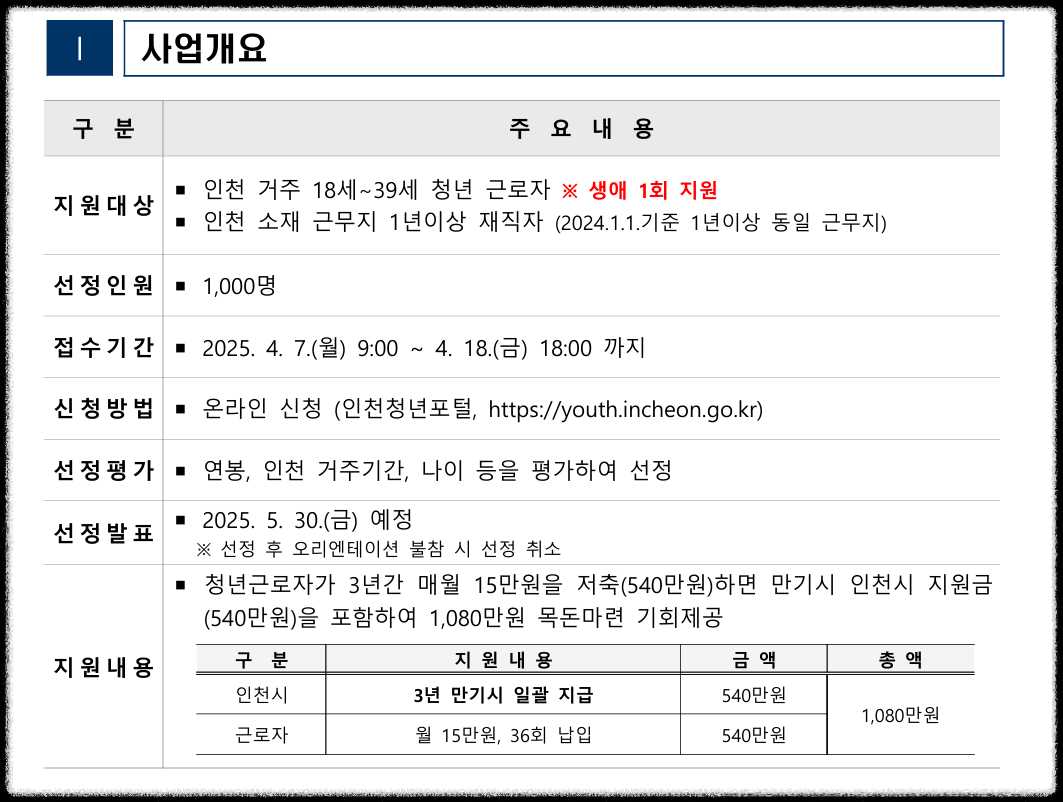 매월 15만 원씩 3년 간 납입하면 원금 540만 원에 인천시의 지원금 540만 원을 얹어서 총 1080만 원의 목돈을 만기 때 수령할 수 있습니다.